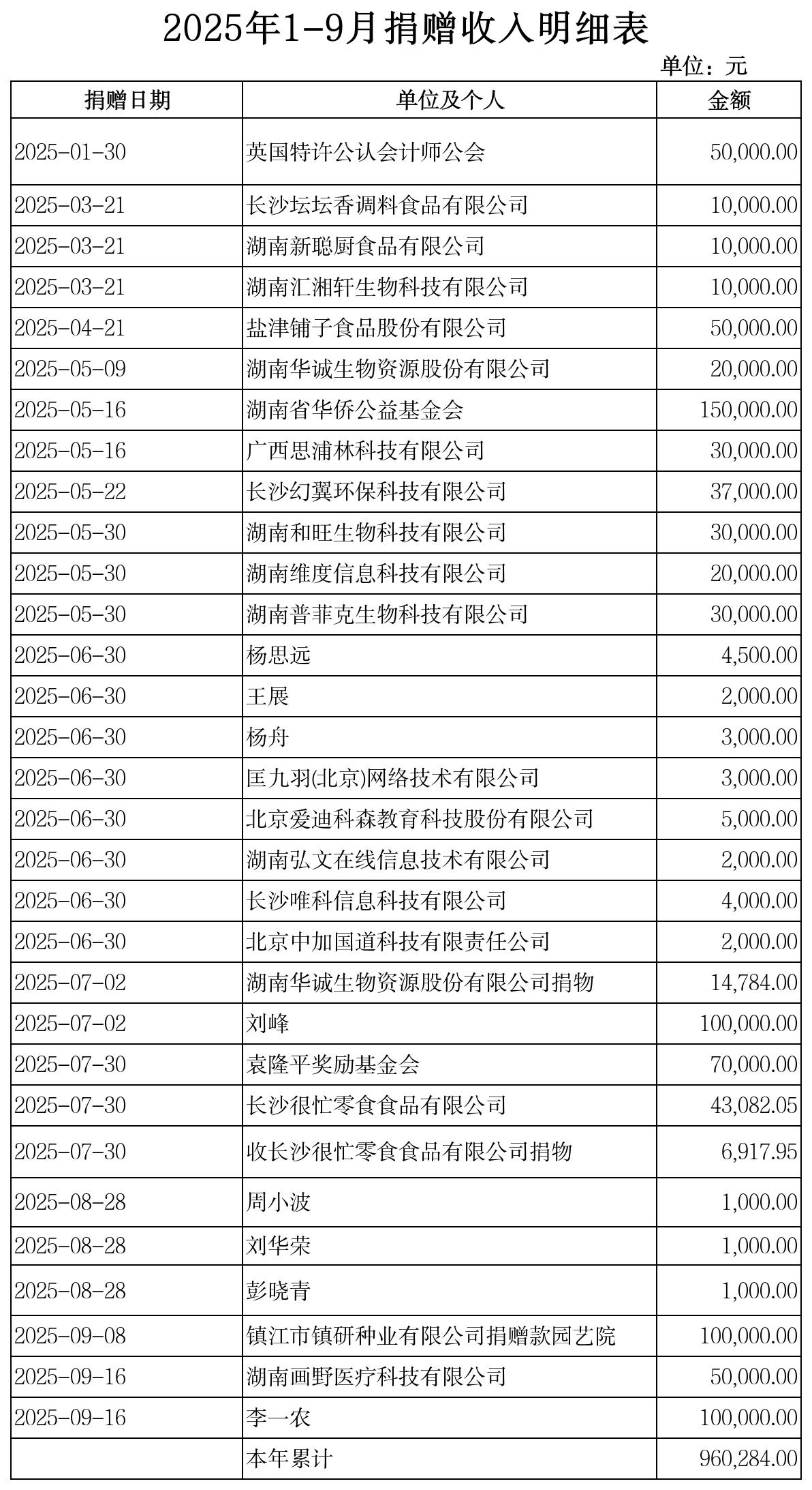 湖南农业大学教育基金会2025年1-9月捐赠收入统计表