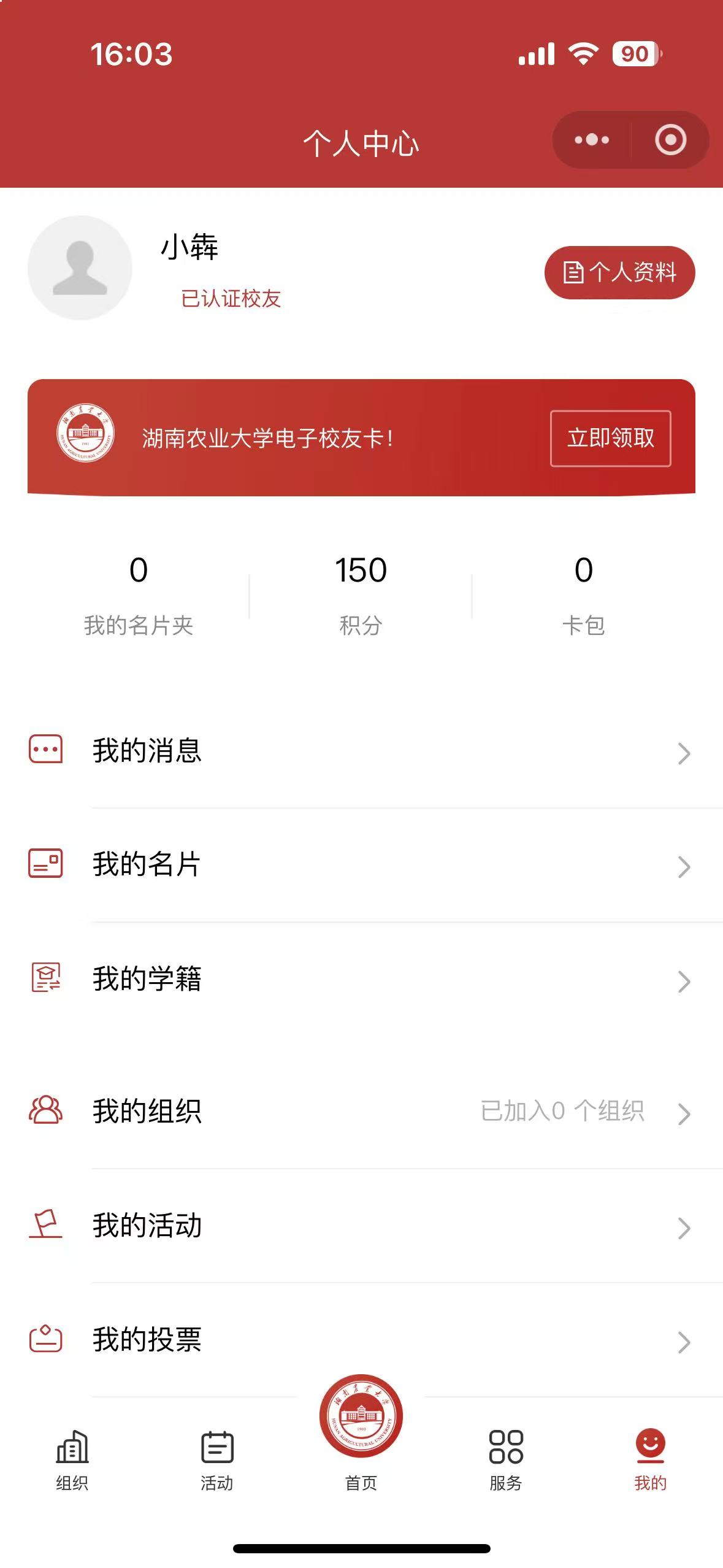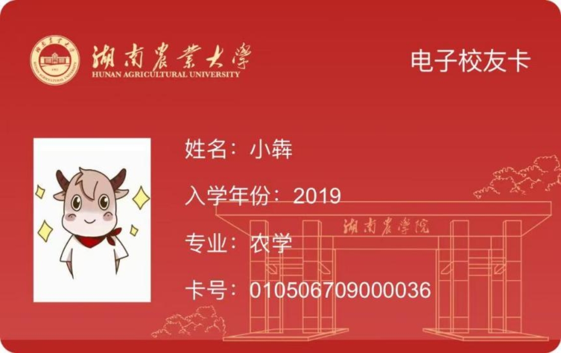 @全体湘农人,为了更好地服务广大校友,湖南农业大学校友总会向各位校友、师生推出专属电子校友卡,此卡将作为您校友身份的有效凭证,快来领取您的专属校友卡,查收校友专享福利吧!