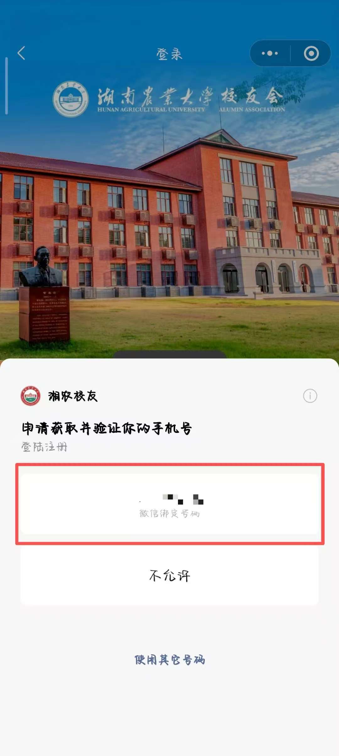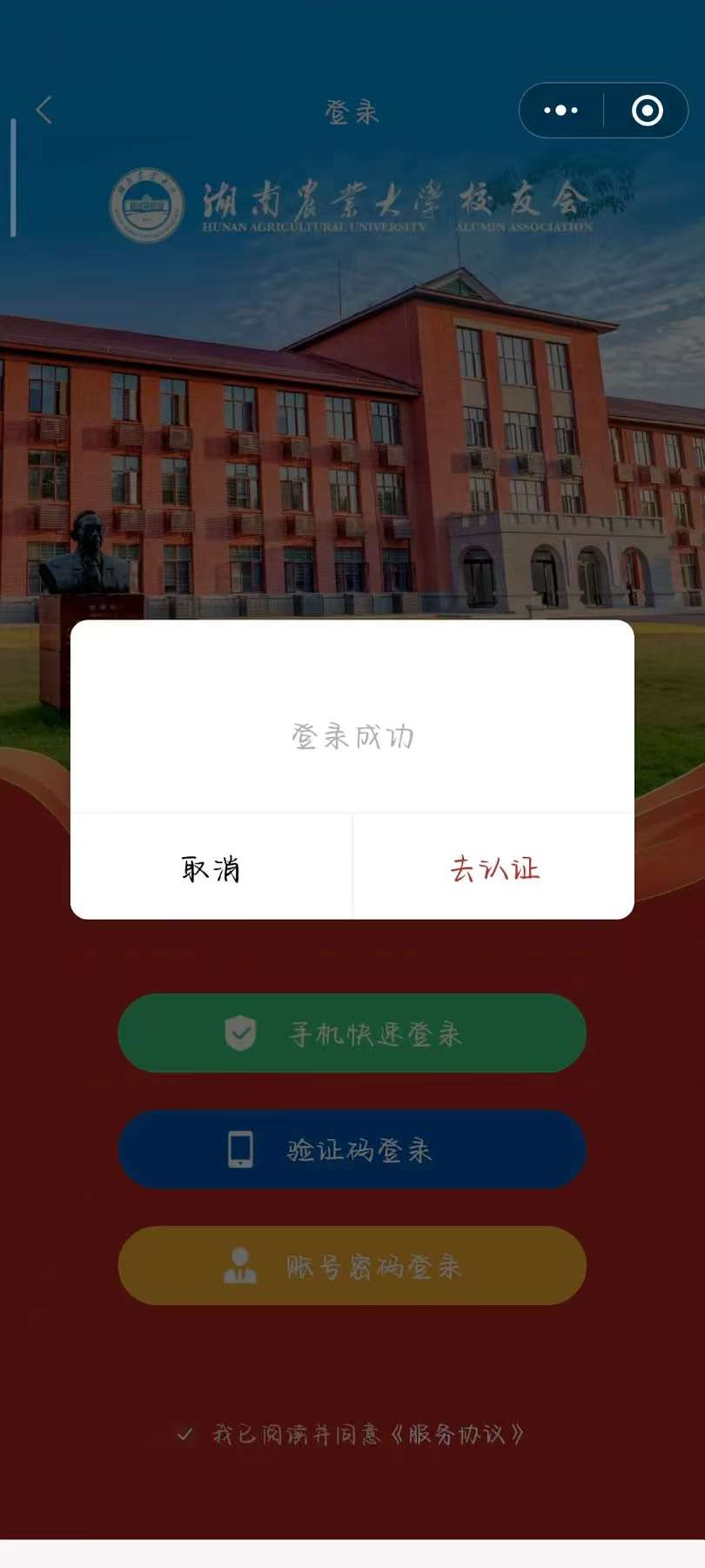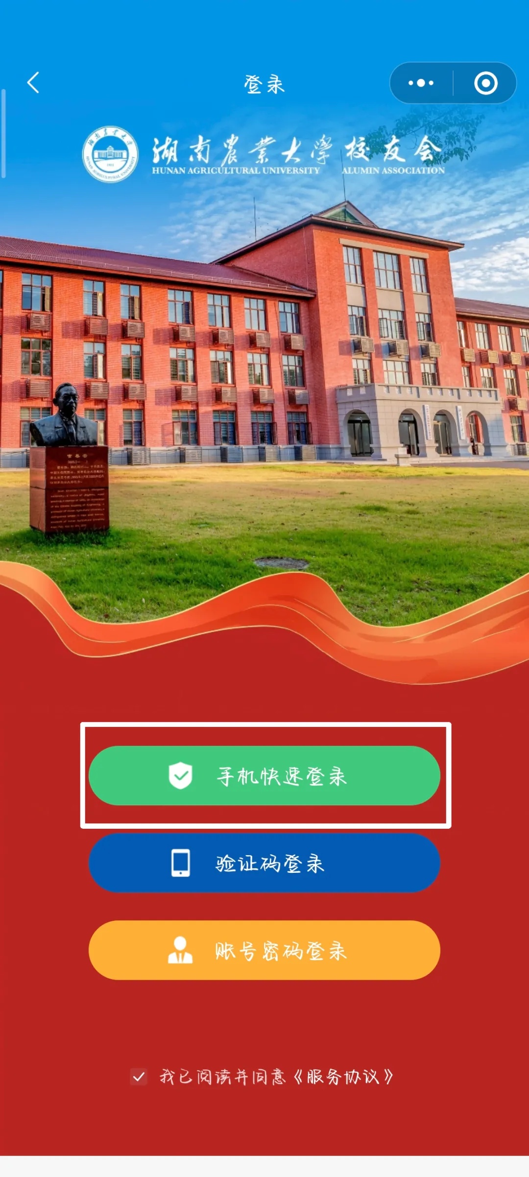 扫描二维码或者搜索进入“湘农校友”小程序后,点击首页“电子校友卡”进入登录界面,勾选下方《服务协议》并点击“手机快捷登录”即可自动注册用户。