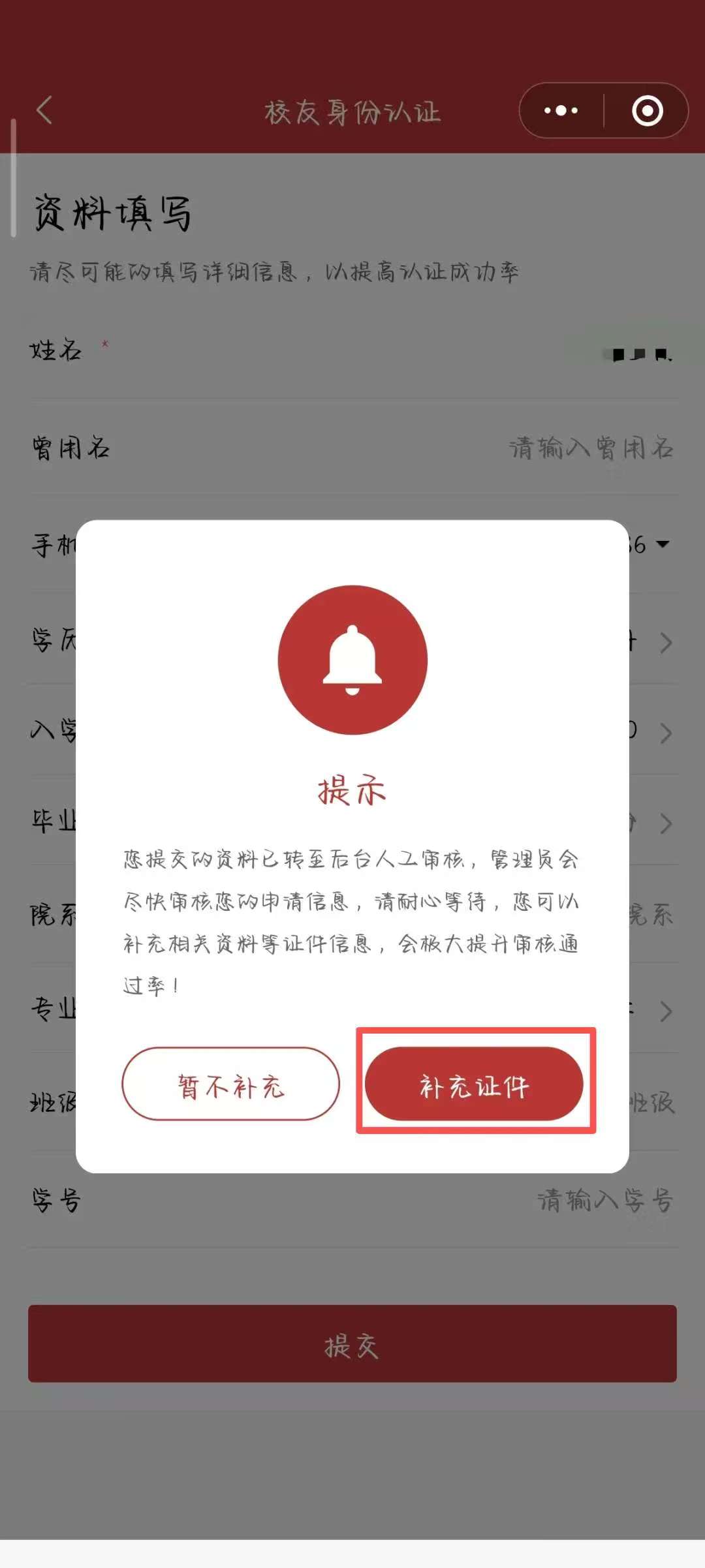 在注册用户后,会弹出认证提示,点击“去认证”来到实名认证,拥有大陆居民身份证的校友可以直接进行实名认证。